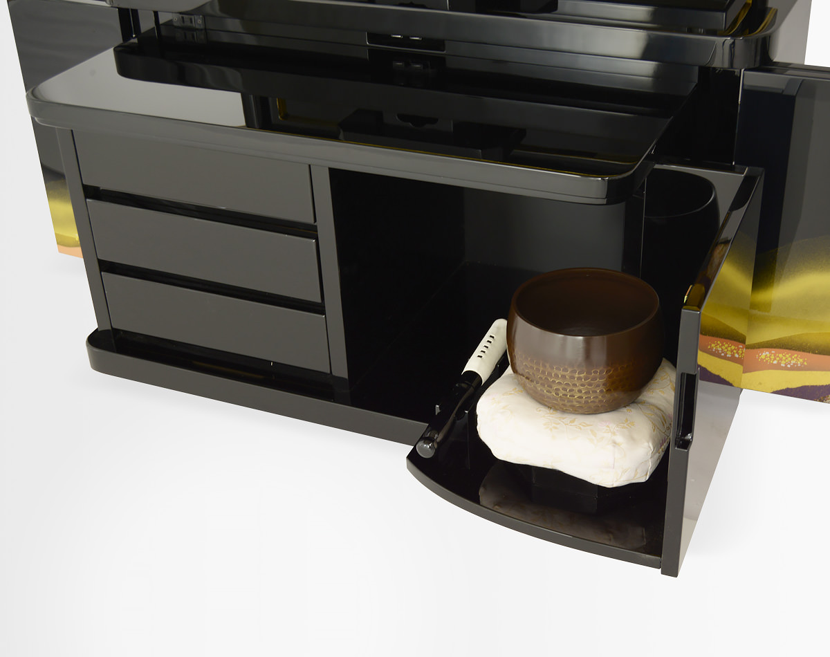 お仏壇の中段部(中間台)には大容量の引出しがついています。普段はあまりご利用にならない大切に保管しておきたいものを収納するのに最適です。