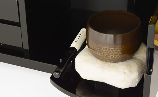 おりんは、扉を開くとたたきやすい位置で止まるように設計されています。普段ご使用にならない時は、きっちりとフタができ、見た目がすっきりし、ホコリも防ぎます。