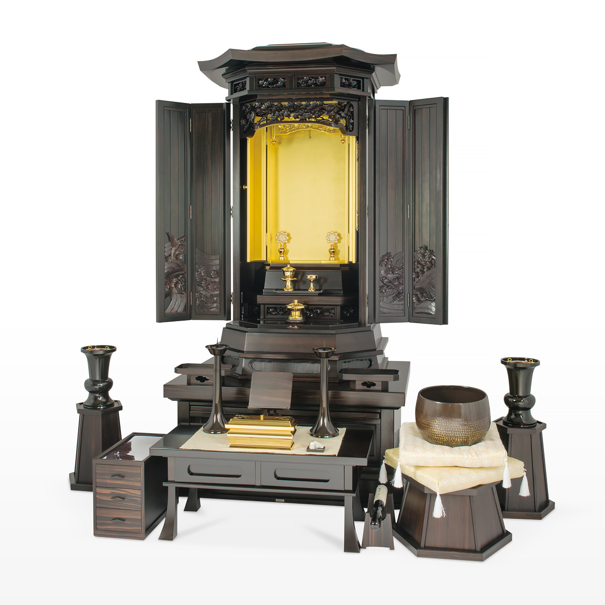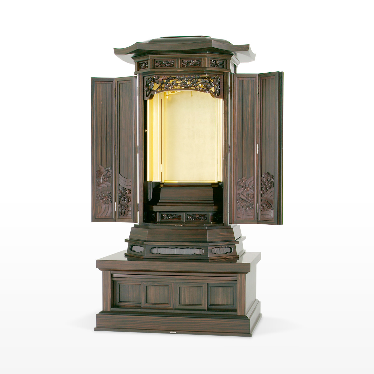 33本黒檀瑠璃鳥-無垢の黒檀製仏壇としては、厨子型仏壇の最上位モデルにあたる、重厚な仏壇です。美しい曲線を描いた欄間と扉に施された瑠璃鳥が舞う彫刻は、圧倒的な迫力だけでなく優しさと安心感を与えてくれます。