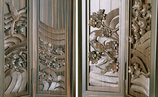 春の穏やかな日差しの中、新しい旅立ちを向かえた青年たちを温かく見守るかのように舞う瑠璃鳥たち。美しい曲線を描いた欄間と扉に施された彫刻は、圧倒的な迫力だけでなく優しさと安心感を与えてくれます。