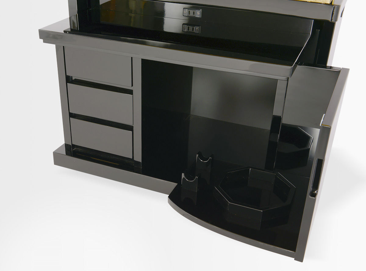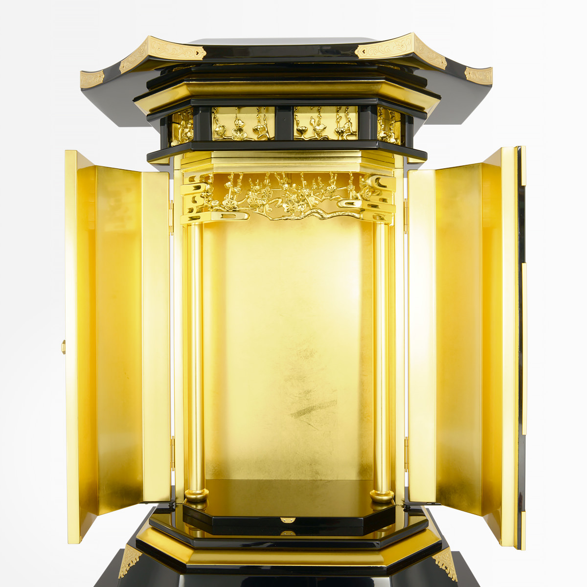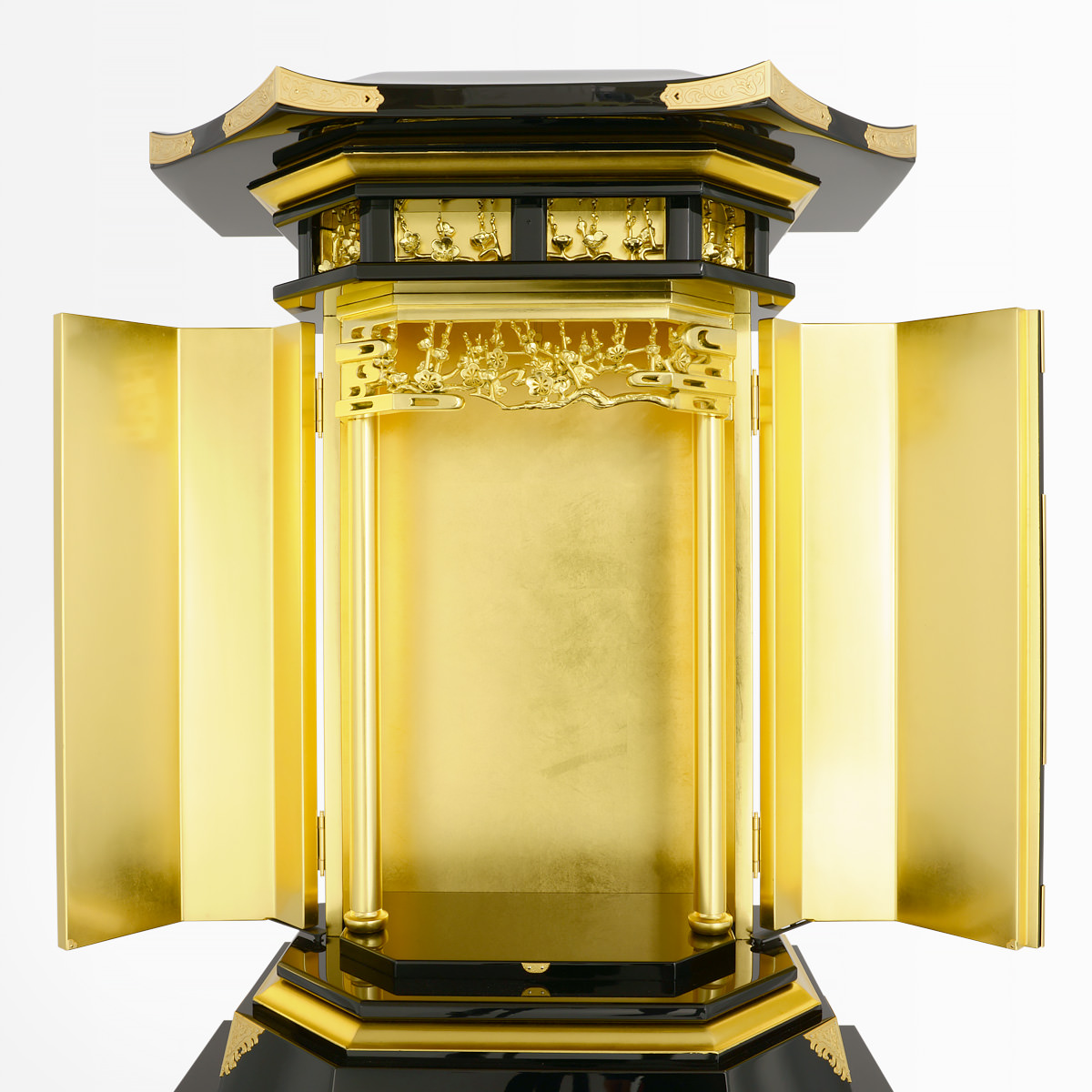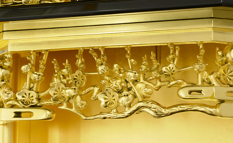 3尺黒塗収納式梅園-金剛堂が誇る黒塗仏壇の風格と気品はそのままに、ご家庭用としてコンパクトにデザインされた3尺黒塗収納式 梅園。上質な魅力を凝縮したそのラグジュアリーでエレガントな存在は比類のない空間を生み出します。