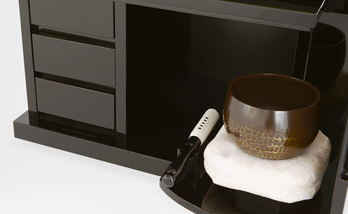 お仏壇の中段部(中間台)には大容量の引出しがついています。普段はあまりご利用にならない大切に保管しておきたいものを収納するのに最適です。