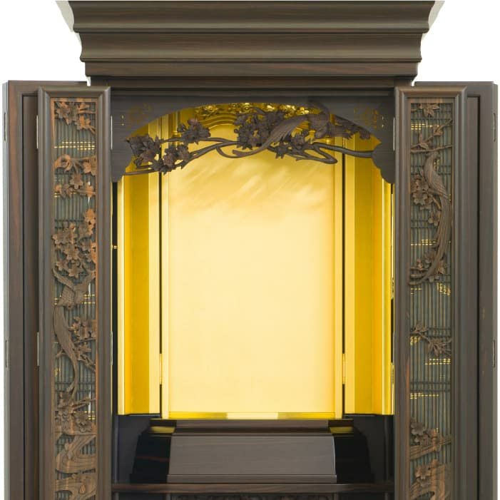 "とびら"から欄間、また"とびら"へ。動きだしそうな、風にゆれる桜と、たわむれる尾長鳥。世界でも類をみない、お仏壇の空間を生かした見事な構図と躍動感ある彫刻が祈りの空間を豊かに彩ります。