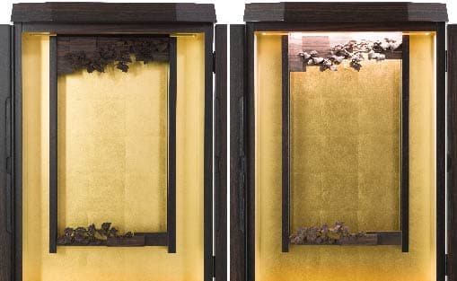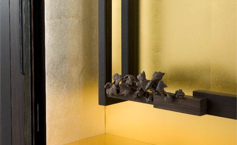 御本尊様をご安置すると、彫刻の蔦をまとった縁が、まるで金銀箔の宙に浮かんでいるよう。虚空会(こくうえ)の儀式をモチーフに、日々の祈りのなかで御本尊様に向かう感動と清々しい決意を表現しました。