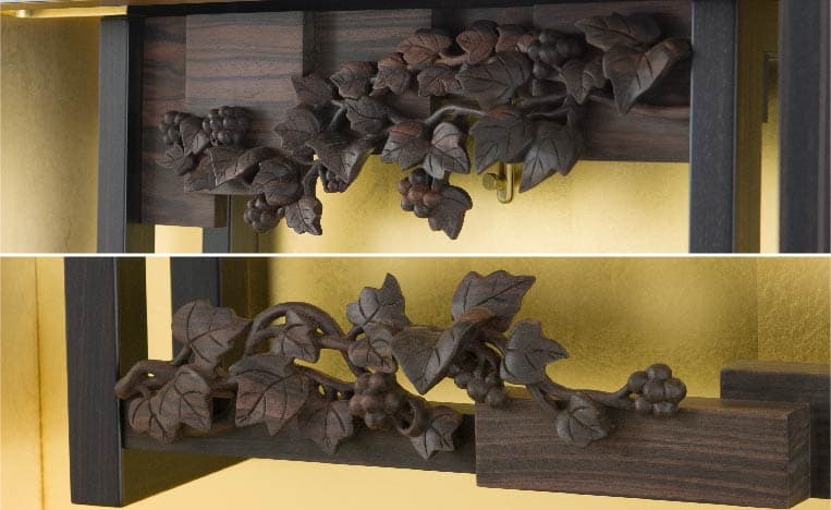 生命力あふれる、エビヅルと蔦は、長く金剛堂でも支持されてきた彫刻デザイン。一見、素朴ななかに、日々伸びゆく成長力と毎日の祈りをたえまなく続く、お花のモチーフの宝相華で彩ります。マホガニ無垢材の温かさのみならず、丈が短くスマートさを感じます。
