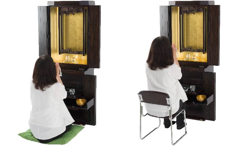 下台のテーブル部と、引き出しのサイズや高さ、りん収納のコンパクトさは、今までないカタチ。低めのイスでも、正座でもお好みによってお使いいただけます。
