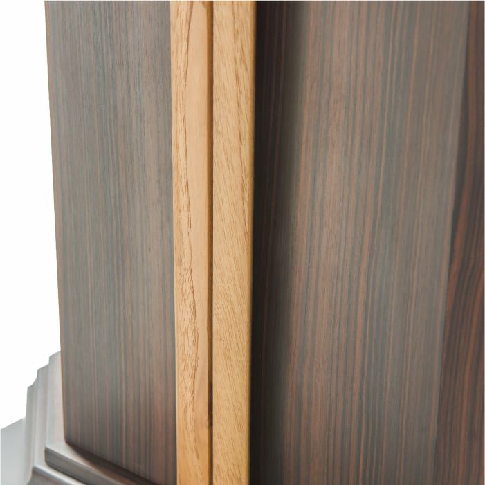 チーク材を合わせたデザインは取っ手として機能し、利便性と美しさを両立しました。また、本体との留め具は埋め込み仕様のマグネット式でスムーズな開閉が可能です。