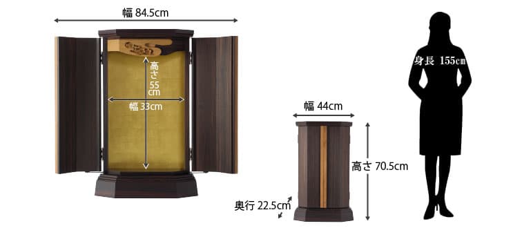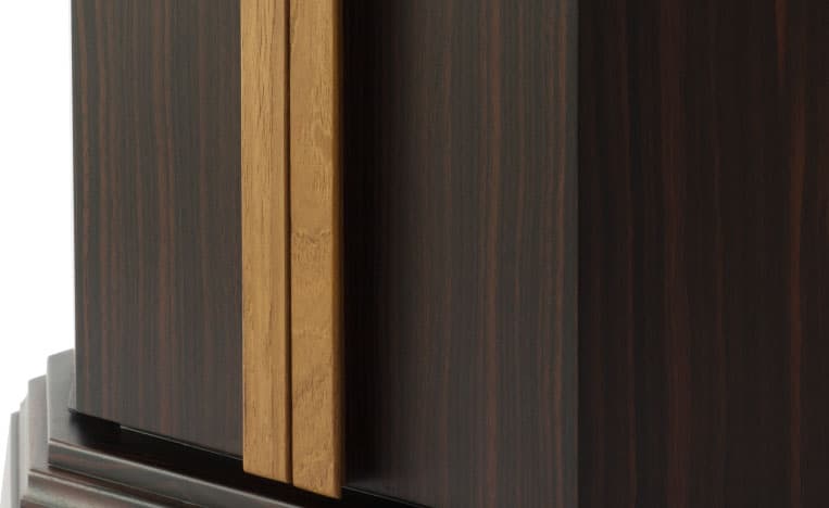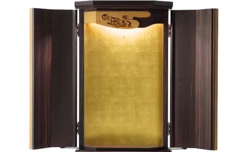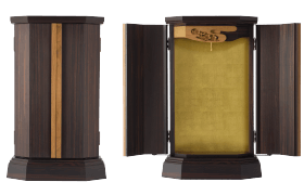 本黒檀×チークを合わせたスタイリッシュさが新鮮。最高級の材を惜しげもなく使い、シンプルに仕立てたいまだかつてないコンパクトさで電動扉式が新登場。当社の技術を余すことなく注いだ、100年使えるお仏壇(100年仕様)です。