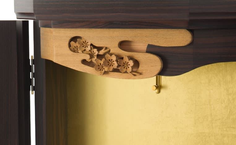 霞の間に見えた、桜の美しさ。一瞬を切り取った彫刻は、シンプルながら技の巧みさを感じます。どんなときも咲き誇る桜は、御本尊様を荘厳するとともに、貴方の祈りにエールを送ります。