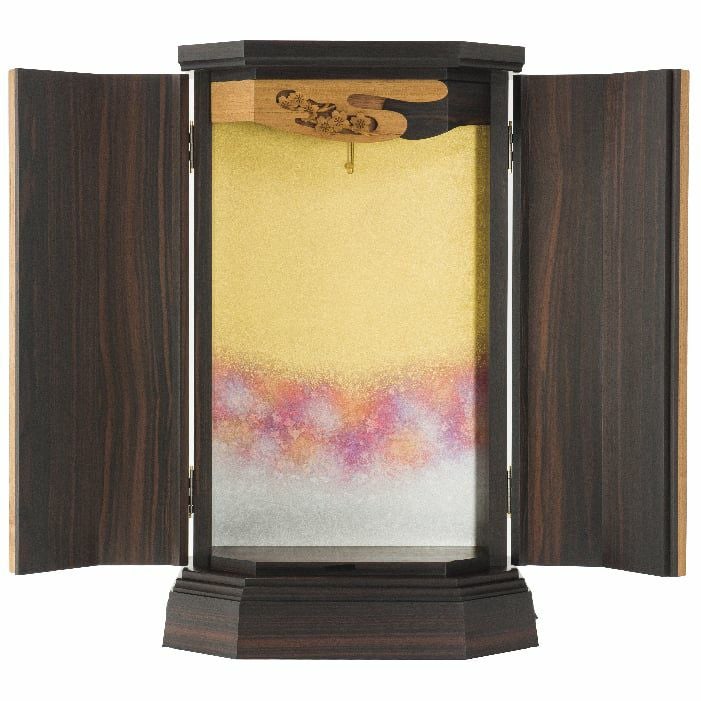 別注で職人が仕立てた、西陣の和紙には本金箔・銀箔を使用。合掌し、唱和しながら厨子のとびらを開くと-美しく華やかな背板に、思わず心が躍る。花吹雪のような桜色も合わさり、祈るあなたにエールを送ります。