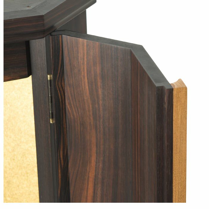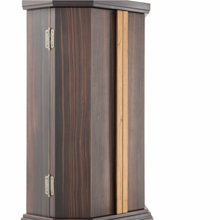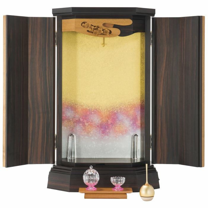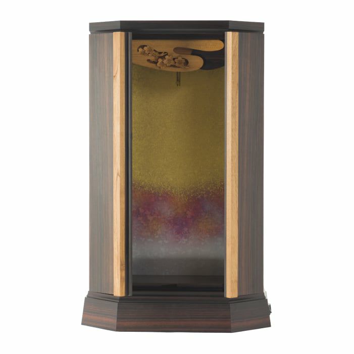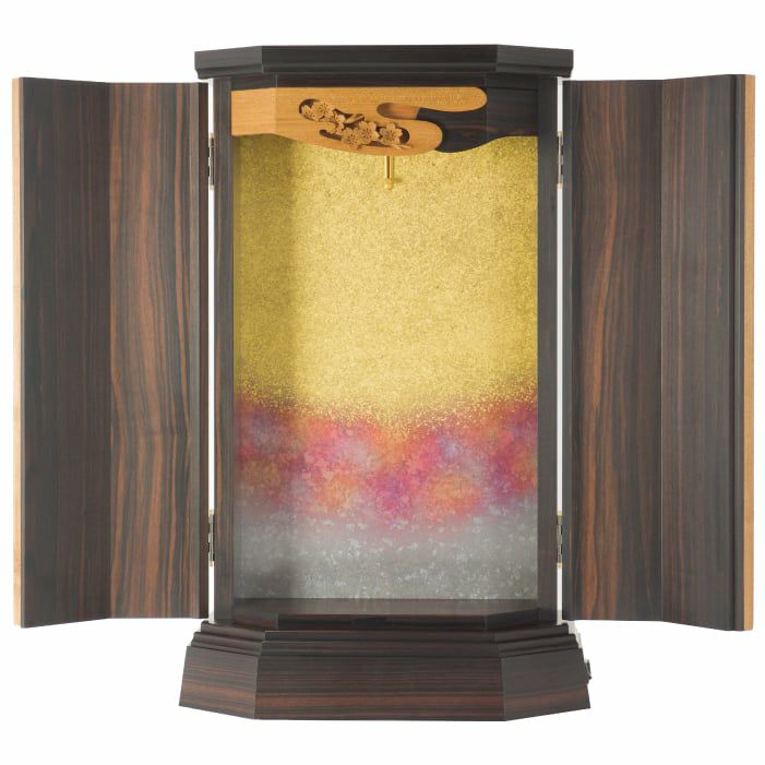 西陣仕様の厨子が華やか。最高級の材を組み合わせた、本黒檀×チークのスタイリッシュさが新鮮。当社技術を余すことなく注いだ、100年使えるお仏壇(100年仕様)です。