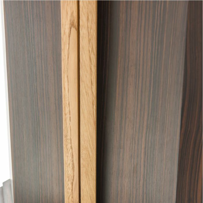 チーク材を合わせたデザインは取っ手として機能し、利便性と美しさを両立しました。また、本体との留め具は埋め込み仕様のマグネット式でスムーズな開閉が可能です。