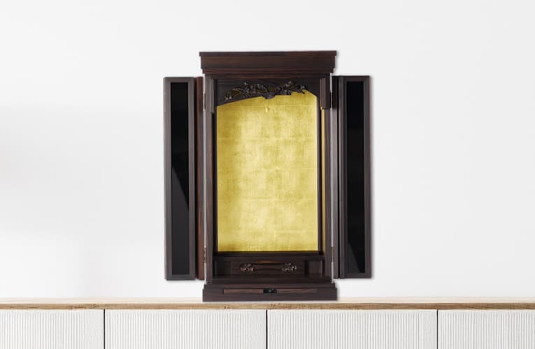 光沢を湛えた漆黒の扉は凛とした空気をまとい、本金箔の輝きは仏壇の外へも溢れ出るよう。小さなお仏壇ながら、御本尊様にしっかりと向き合いたくなる、心地よい緊張感を持ち合わせています。