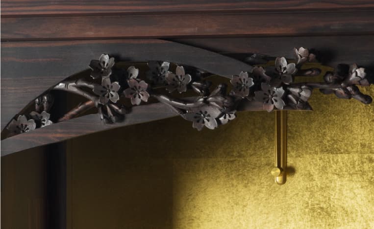 桜の花ひとつひとつは小さいですが、集まり咲いた時の見事さは、息をのむほどに人の目を和ませます。ムクの黒檀に巧みに彫り込まれた「桜結び」の彫刻は、清楚でいて華やかな桜のイメージを立体的に表現しました。