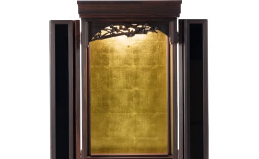 艶やかな黒塗りの扉が美しいお仏壇です。職人の重ね塗りから生まれた漆黒の光沢。本黒檀の無垢木の自然が生んだ剛質さ、厨子内の本金箔の溢れんばかりの輝きが調和した至高の逸品です。