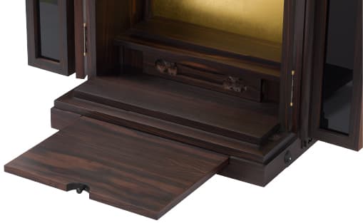 上置仏壇ながら引き出し付き。日々、ご利用になられるお念珠やお経本などを収納するのにとても便利です。