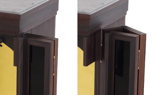 前面の扉のみを開くことができるほか、正三方開きもできます。正三方開きは上からみると△(三角)になる扉の開きかた。両側面の前側が開くから、斜めや左右に座られる方も御本尊様を拝しやすいようになっています。