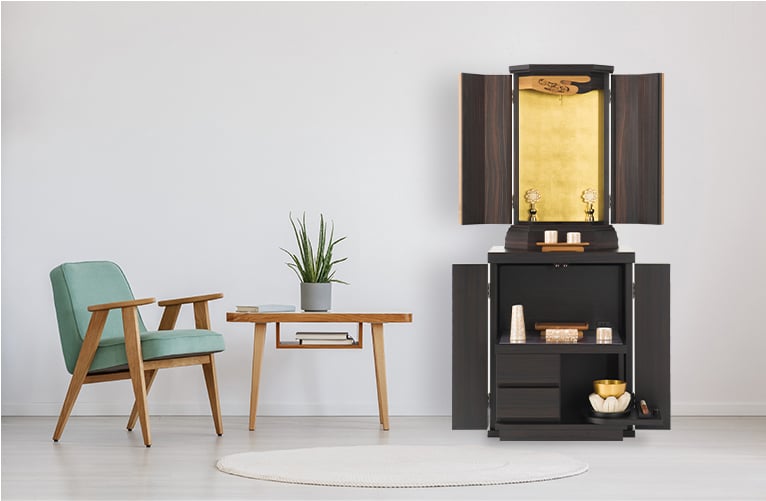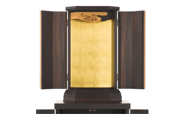 金剛堂で、最も小さな黒檀のお仏壇です。本黒檀×チークを合わせたスタイリッシュさが新鮮な本金箔の厨子に、下台をセット。限られたスペースでも、御本尊様を荘厳にご安置できるお仏壇として人気です。