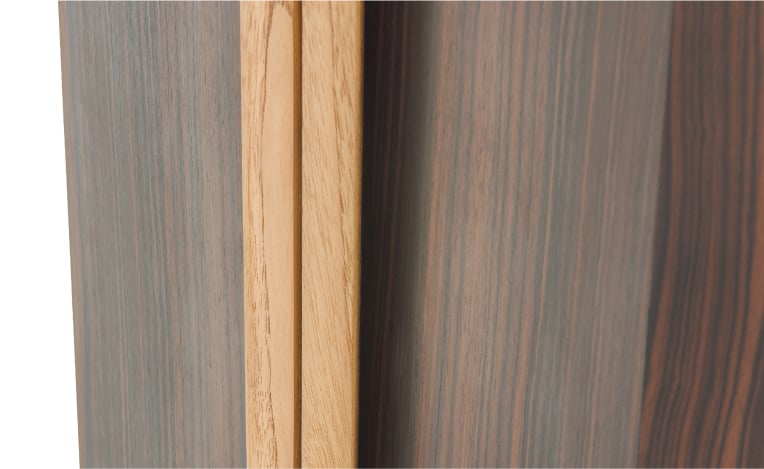 チーク材を合わせたデザインは取っ手として機能し、利便性と美しさを両立しました。また、本体との留め具は埋め込み仕様のマグネット式でスムーズな開閉が可能です。