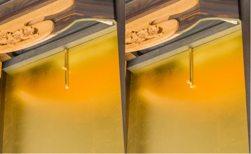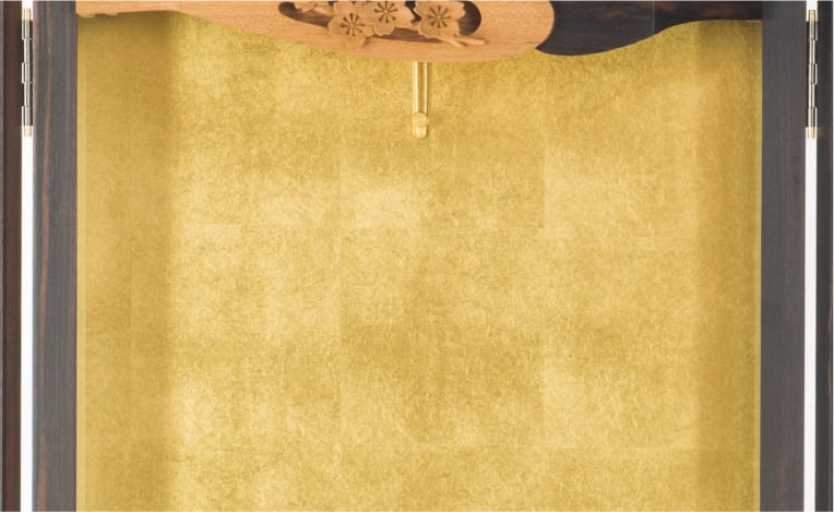 高貴な輝きに溢れた厨子。施された本金箔は、温度や湿度に左右されることなく、何百年、何千年と輝きが失われることはありません。伝統工芸を今に受け継ぐ金箔師の技が冴え永遠の輝きが御本尊様を荘厳します。