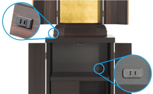 仏壇の外側と、下台の経机前にコンセントがついています。置トーロや電気ローソクをご利用いただくのに便利です。