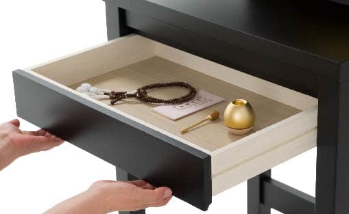 まごころのお供えも、しっかりできるよう開発。祈るお手元に置きたい、りんなどは、テーブルのスライド部を使うとより祈りやすくなり、普段は、すべて収納して頂けます。(引き出しに念珠・お経本・念珠入れ・リンまで収めてみる)