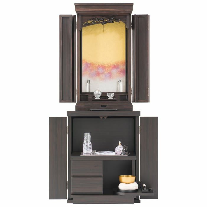西陣仕様の厨子が華やか。小さくても、最高級の仏壇です。金剛堂でもっとも小さなお仏壇セットです。素材は本黒檀。愛らしい桜の彫刻。伝統と、当社の技術を余すことなく注いだ、100年使えるお仏壇(100年仕様)です。