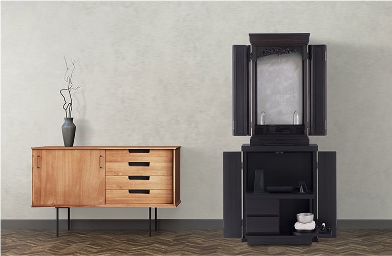 収納式の経机は安定感があり、仏具などを置いてご使用いただけます。使わないときは仕舞えて扉を閉めればスッキリと収めることができます。