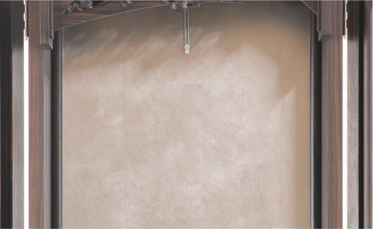 職人が押したプラチナ箔のもつ、静寂を感じる光は厳かさを湛えています。深みを感じるシルバーは、御本尊に向き合うあなたを、静かに照らす月光のよう。伝統工芸を今に受け継ぐ箔師の技が御本尊様を荘厳します。