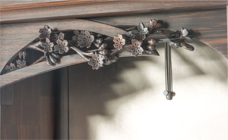 桜の花ひとつひとつは小さいですが、集まり咲いた時の見事さは、息をのむほどに人の目を和ませます。ムクの黒檀に巧みに彫り込まれた「桜結び」の彫刻は、清楚でいて華やかな桜のイメージを立体的に表現しました。
