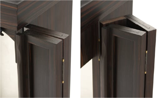 扉は正三方開きという、前面・両側面が開く作りになっており、左右に座られる方も御本尊様を拝しやすいようになっています。もちろん側面を固定して前面の扉のみを開くこともできます。