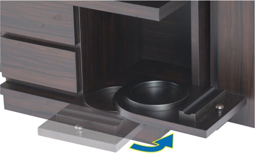 りん収納部は、コンパクトにしまえて、たたきやすい位置まで引き出せる設計。普段ご使用にならないときは、扉を閉めることでフタができ、ホコリを防ぎ、すっきりと美しい外観を保てます。