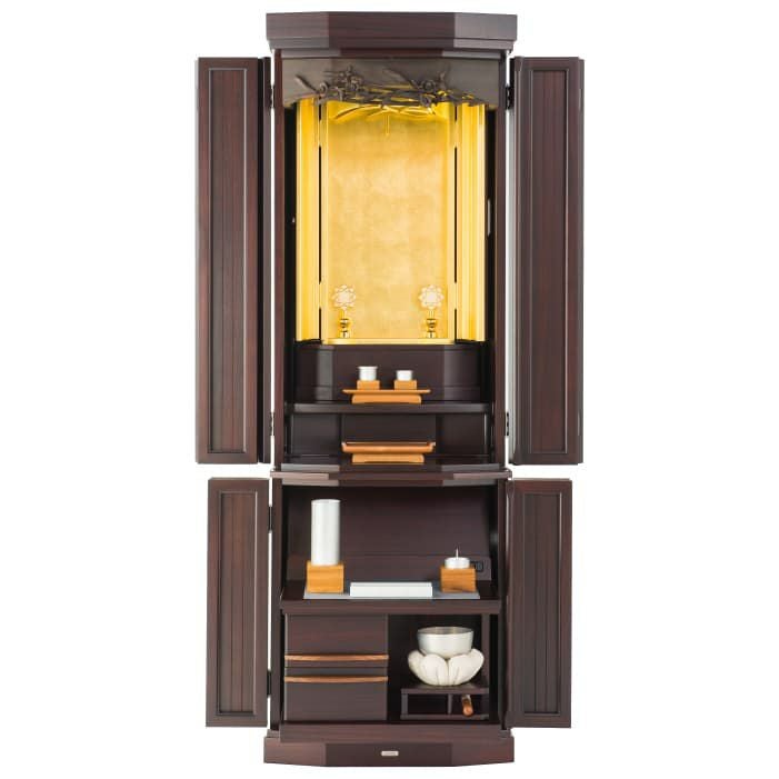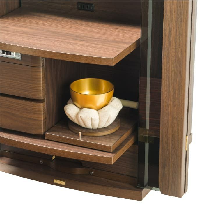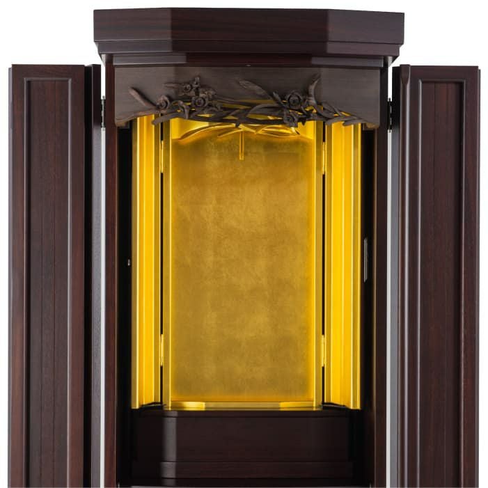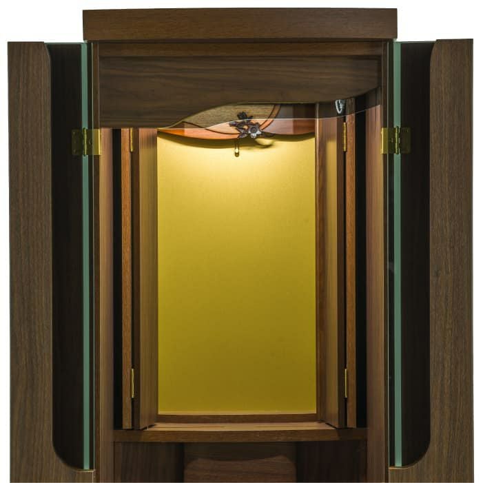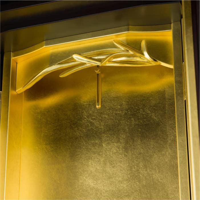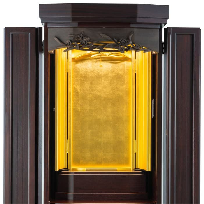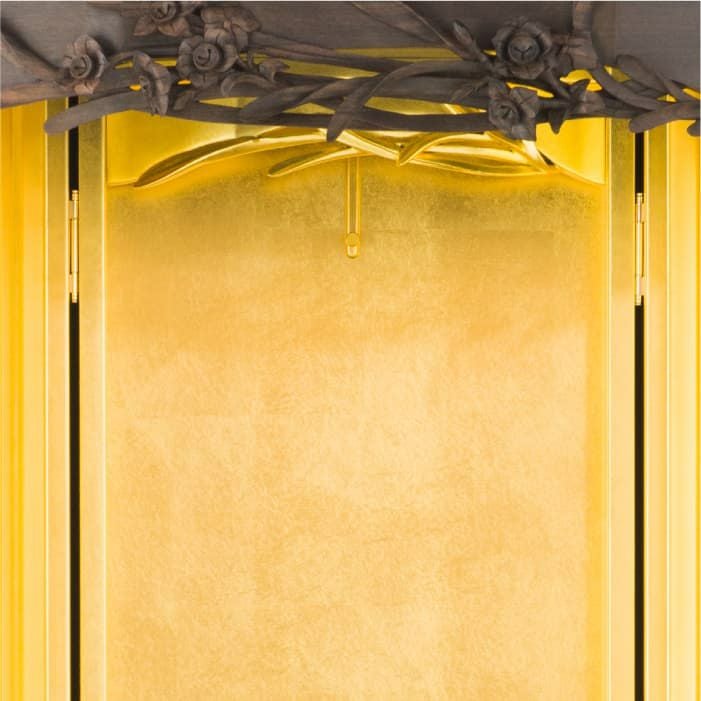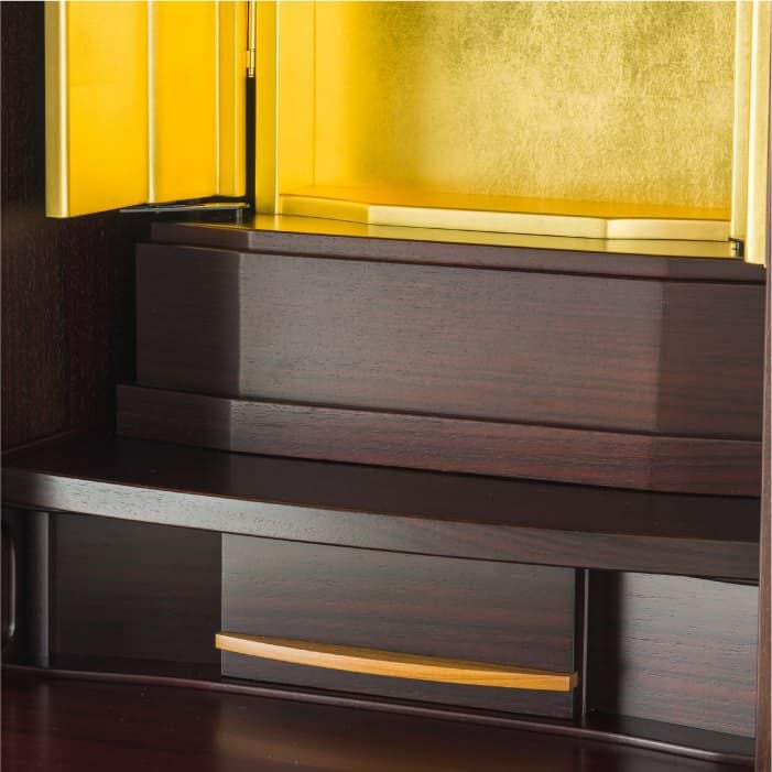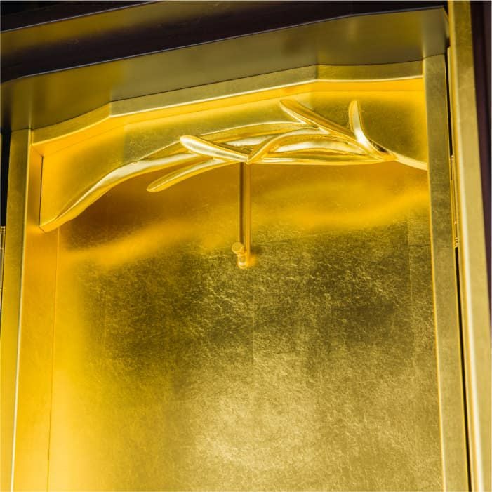 最高級の本黒檀を”今を生きる”私たちにフィットするお仏壇として再構築。扉を開けたときの本金箔の輝きが祈りを加速させます。