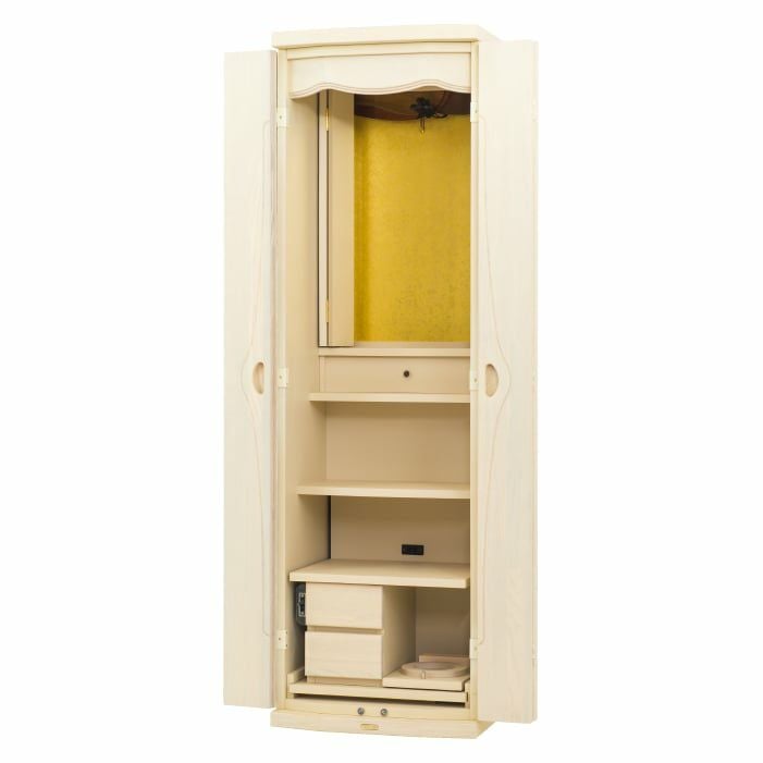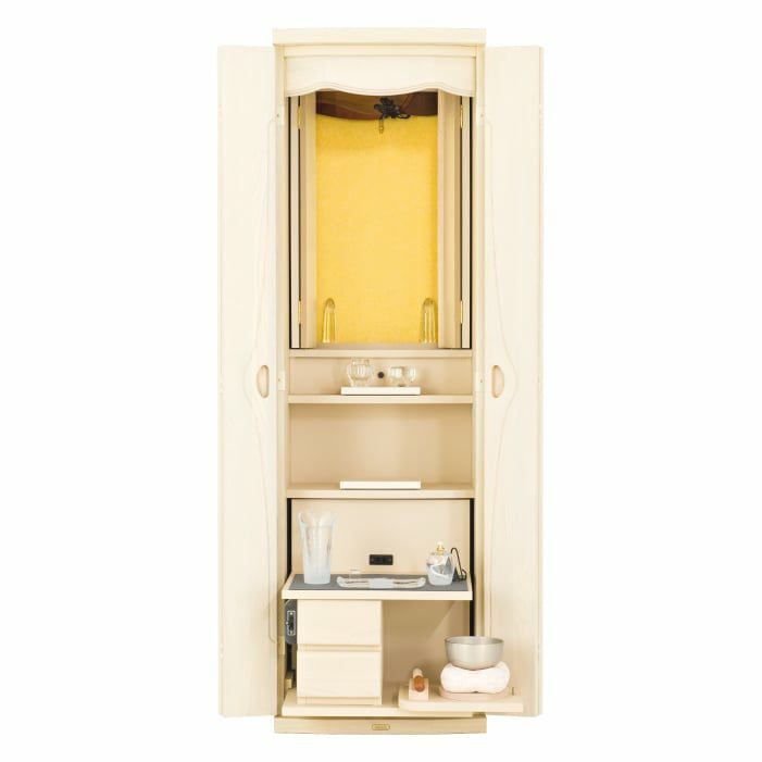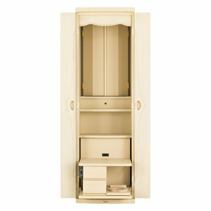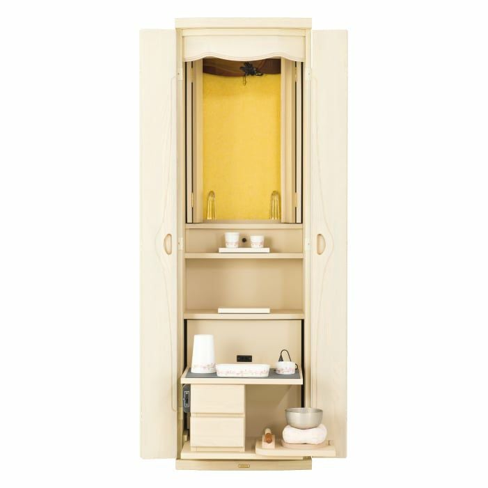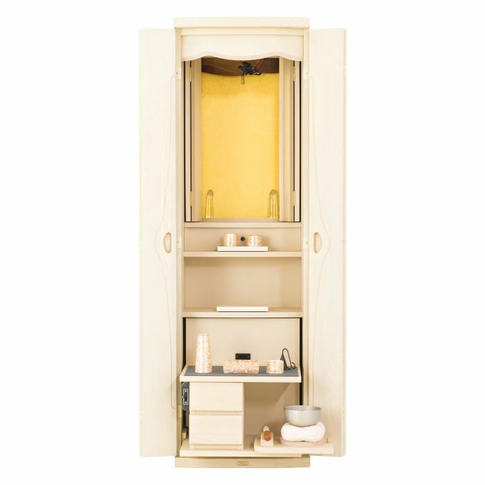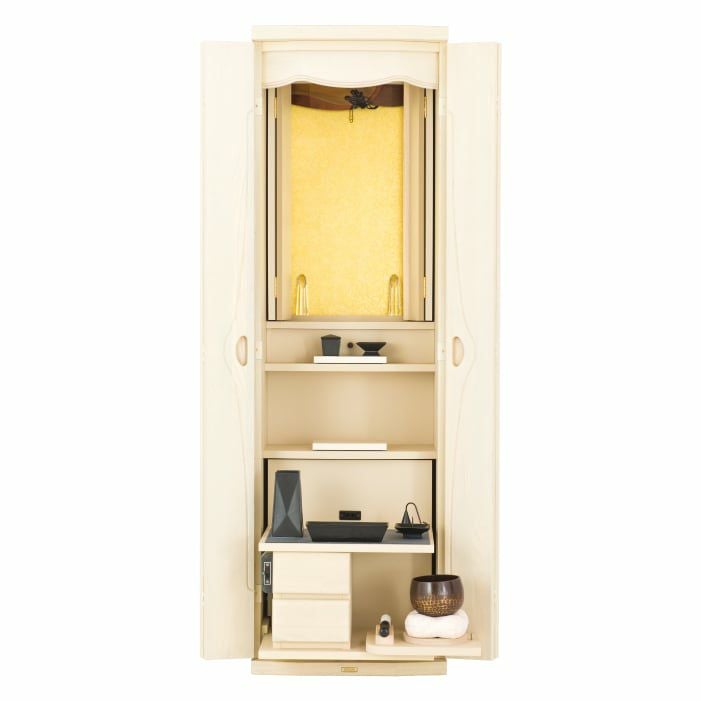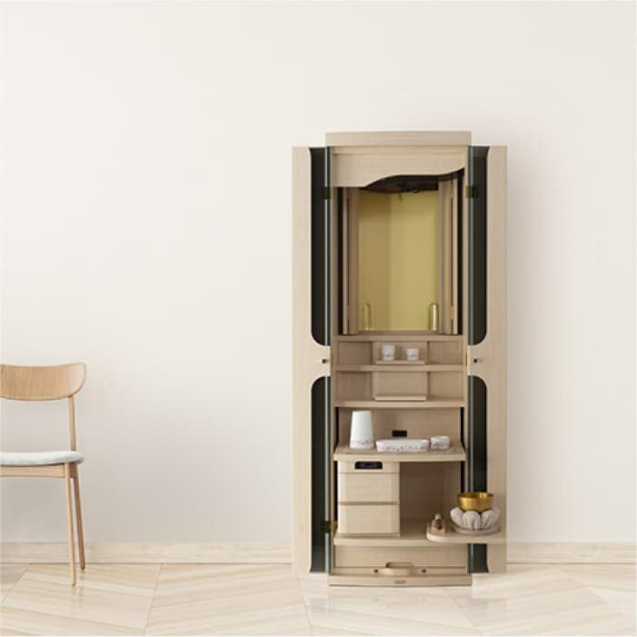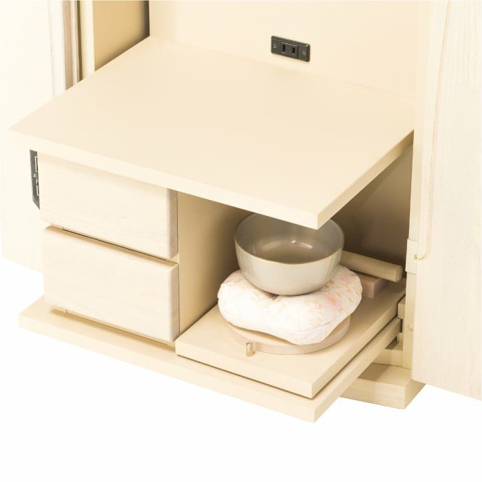 お部屋にもなじむ木調のホワイトが軽やかなお仏壇。魅力的な価格と、ミニマルなシンプルさが愛されています。