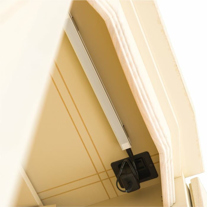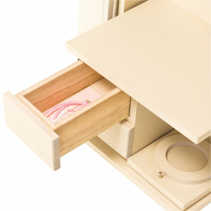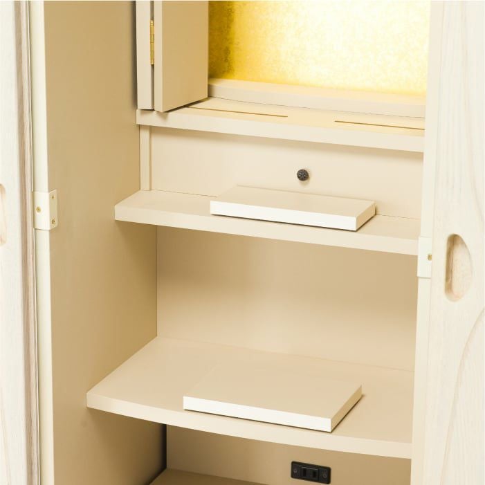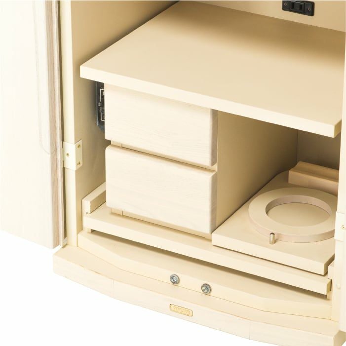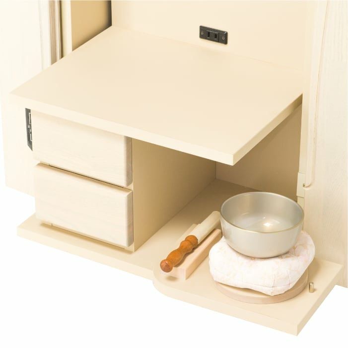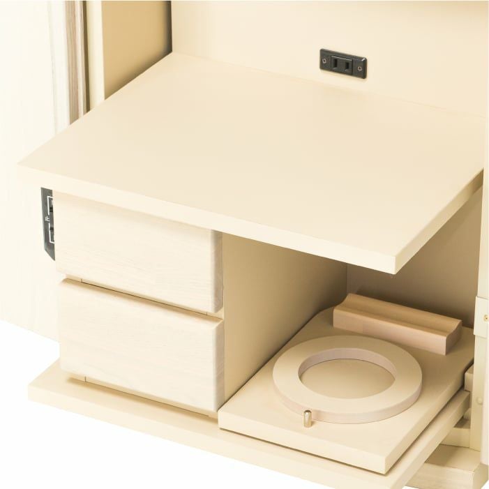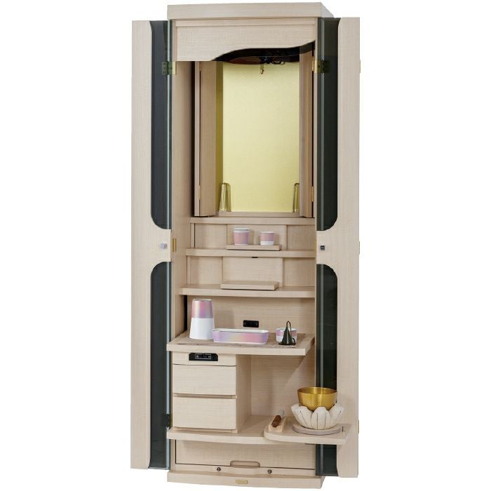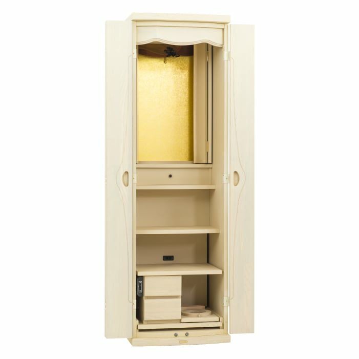 お部屋にもなじむ木調のホワイトが軽やかなお仏壇。魅力的な価格と、ミニマルなシンプルさが愛されています。