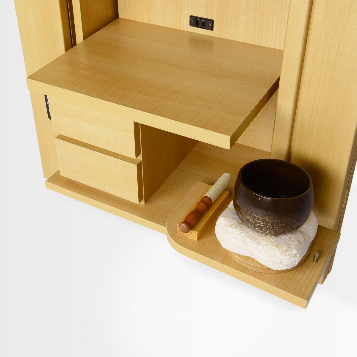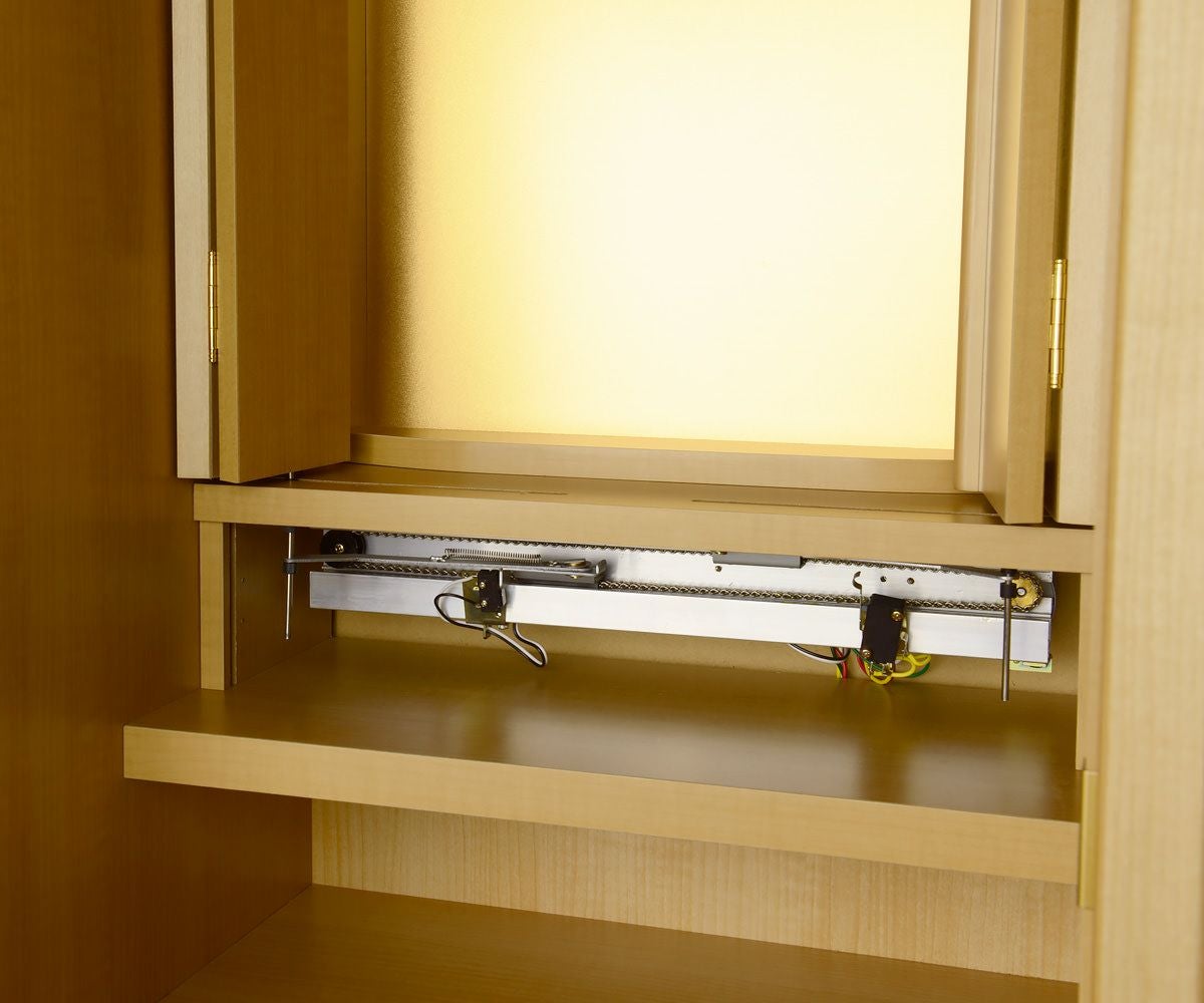 お部屋にもなじむ木調のホワイトが軽やかなお仏壇。魅力的な価格と、ミニマルなシンプルさが愛されています。