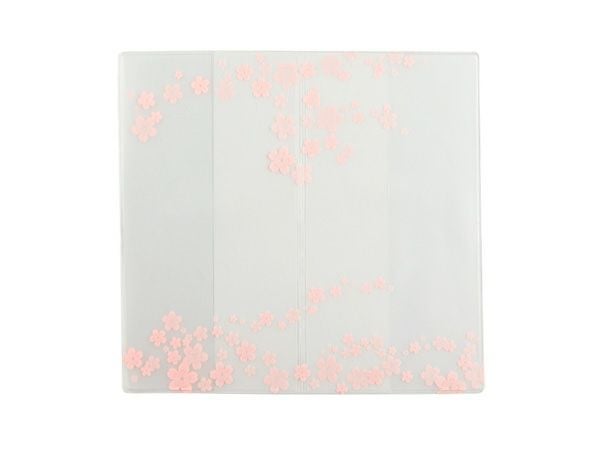 半透明のビニール製で、全体に桜の花びらをあしらった女性向けのカバーです。お経本を汚さず大切に使えるよう是非お使い下さい。
