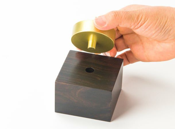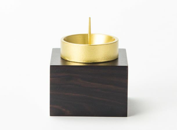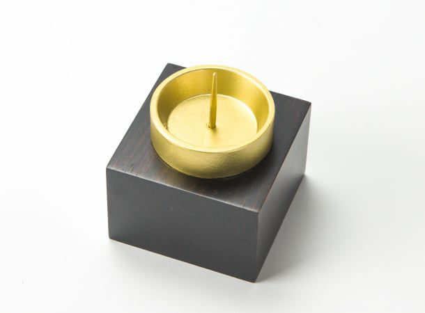 重厚な金色の器に、無垢の黒檀台がついたローソク立てです