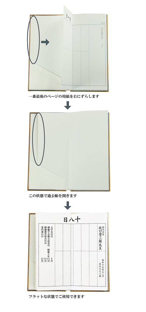 この過去帳は、表紙・ウラ表紙に厚みがあるため、ページの真ん中(15日ぐらい)を開けた時に紙が盛り上がってうまく開けれない時があります。その場合、下の写真のように、最後のページの用紙をずらすことで解消し、フラットな状態に開けることができます。